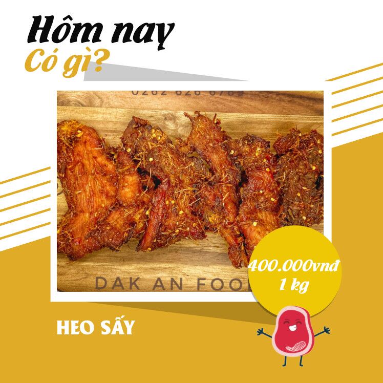 Heo sấy khô là sản phẩm chế biển sẵn với thành phẩm là những miếng thịt được tẩm ướp gia vị và trải qua công đoạn sấy khô. Sản phẩm được hít chân không kỹ càng. Hạn sử dụng lên đến 6 tháng.